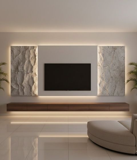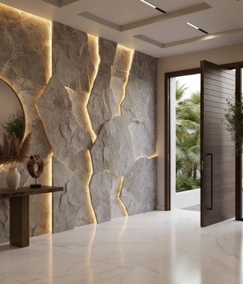 تُستخدم لإبراز جدار مميز داخل المكان، مثل جدار الصالة أو المدخل، وتعطي مظهرًا فخمًا بدون وزن الحجر الحقيقي.